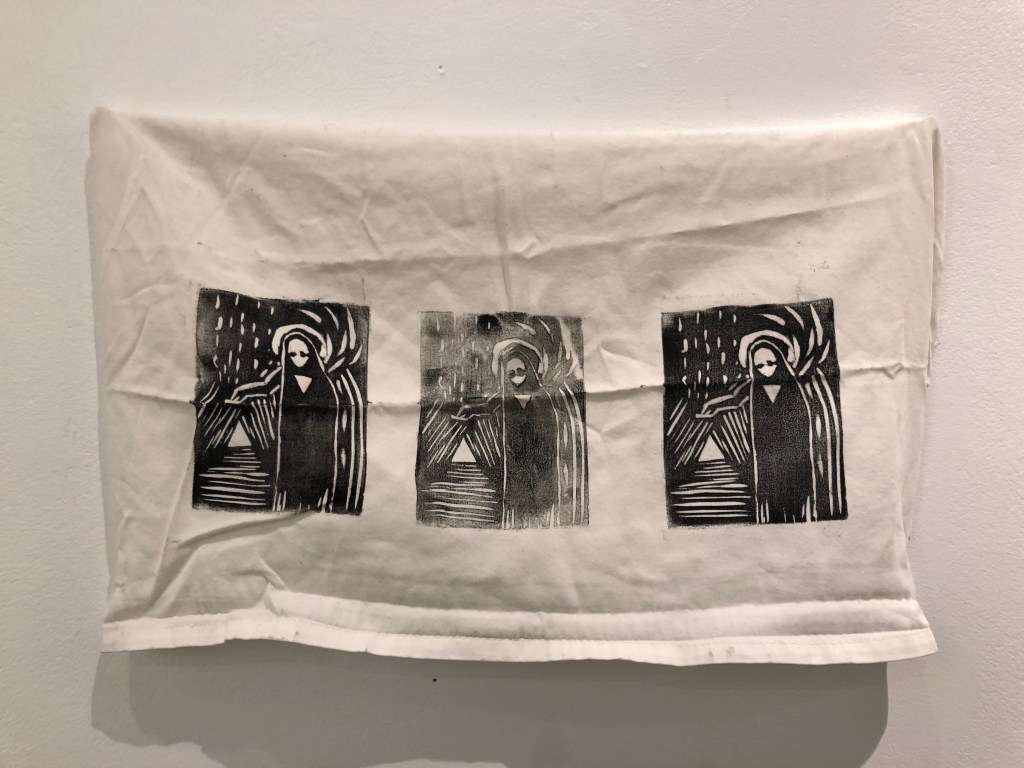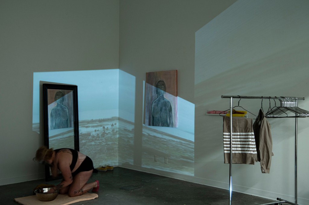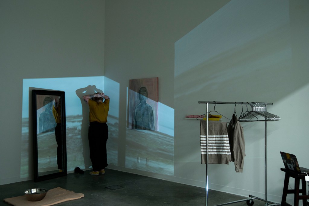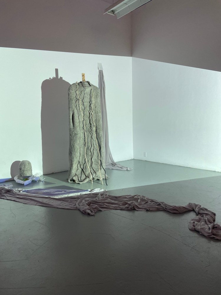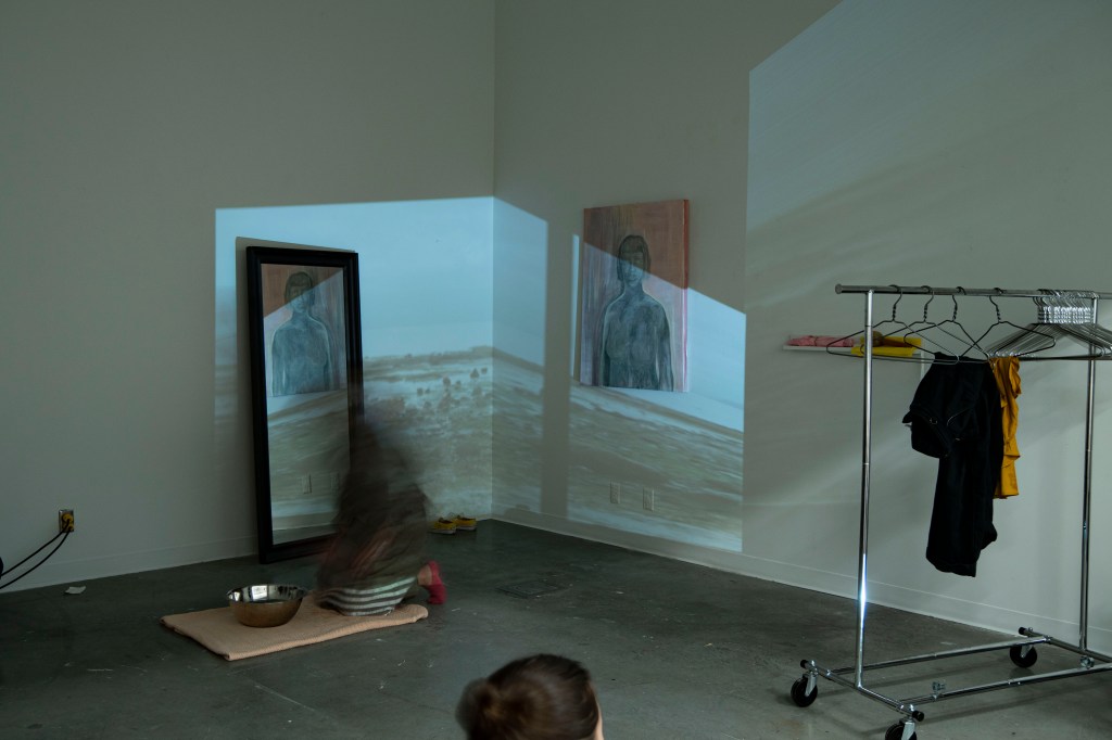 Dismantled -2. Handmand Ribbon Skirt & Shirt, Human Hair, Beeswax, Video Projection, Mirror, Screen Print – 2023 February